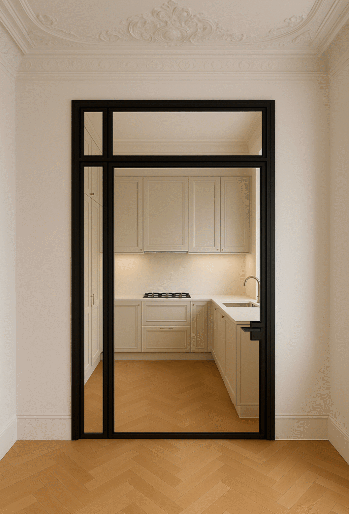 Dieses Projekt zeigt eindrucksvoll, wie Altbaucharme und moderne Gestaltung eine harmonische Verbindung eingehen können. Im Mittelpunkt steht eine elegante Lofttür aus schwarzem Stahl mit großen Glasflächen und einer horizontalen Sprosse. Sie fügt sich perfekt in die prachtvolle Altbausubstanz mit ihren aufwendig gearbeiteten Stuckdecken und dem Fischgrätparkett ein.